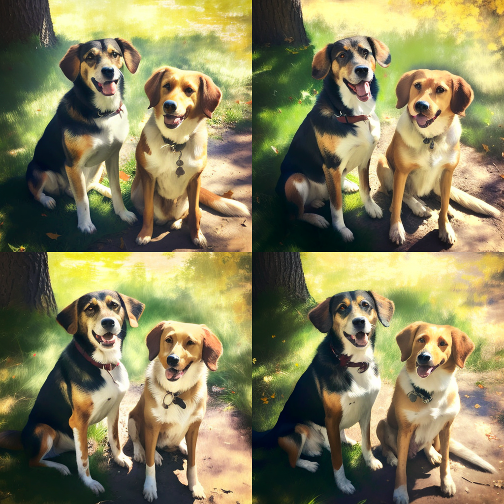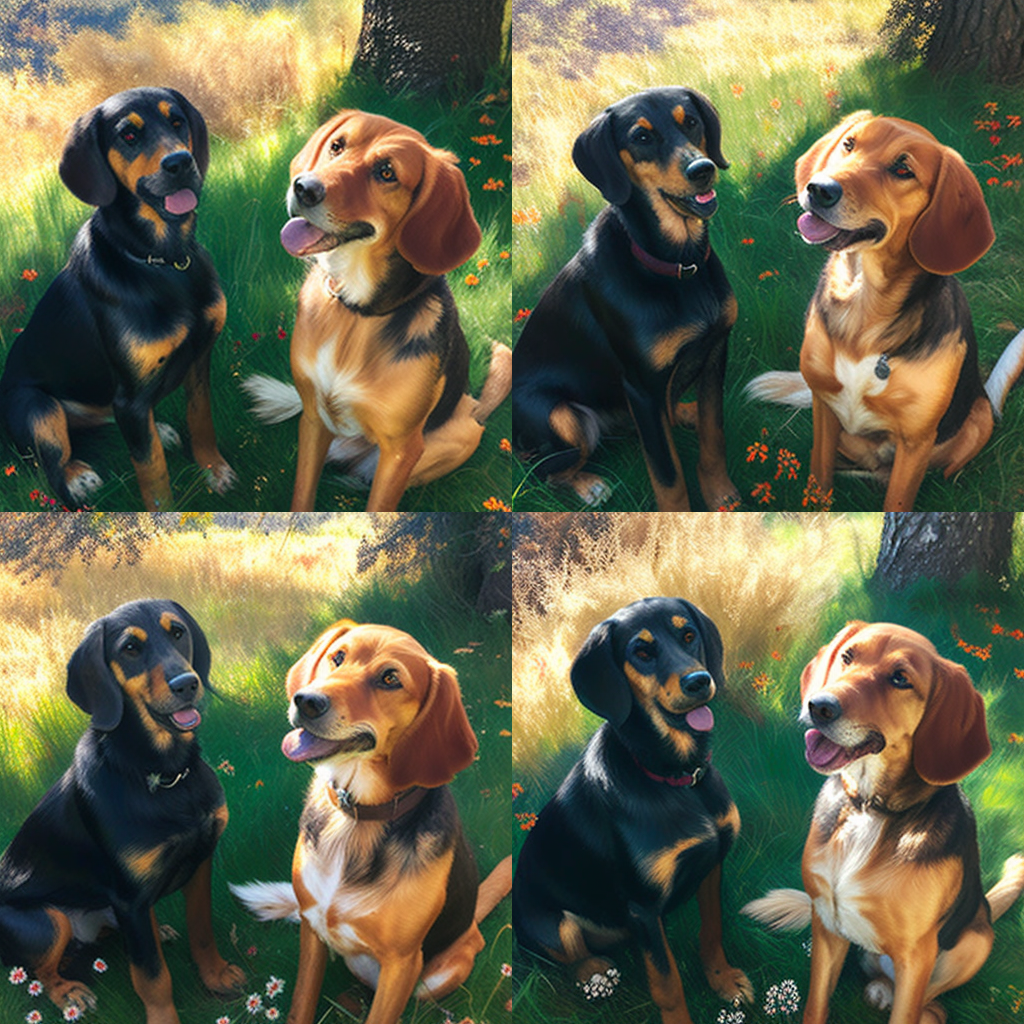 After a few refinments describing the dogs, I got this.. pretty close. The top right pic was further upscaled for the dinal verion
