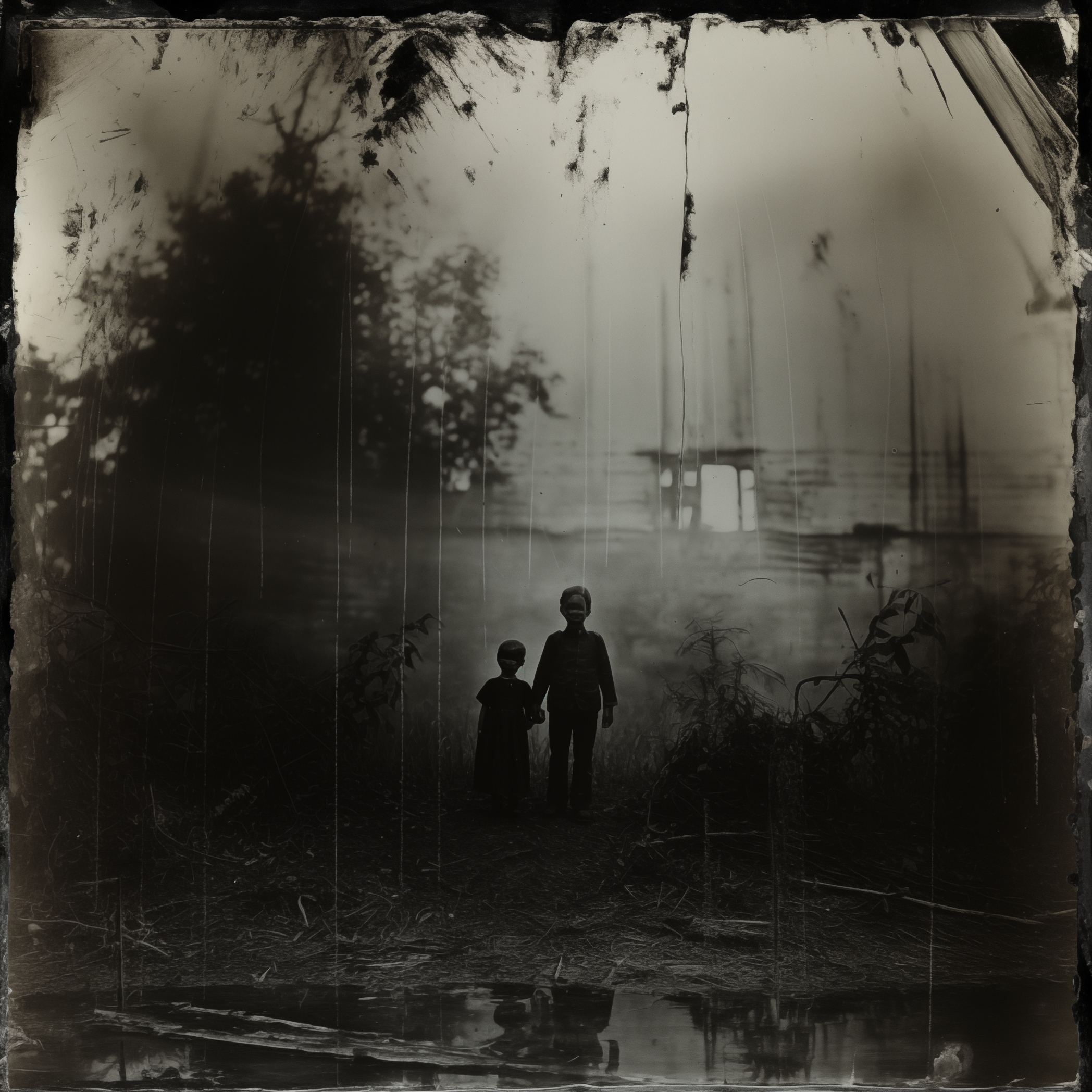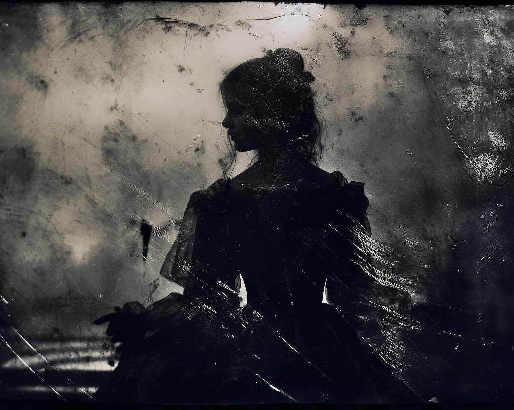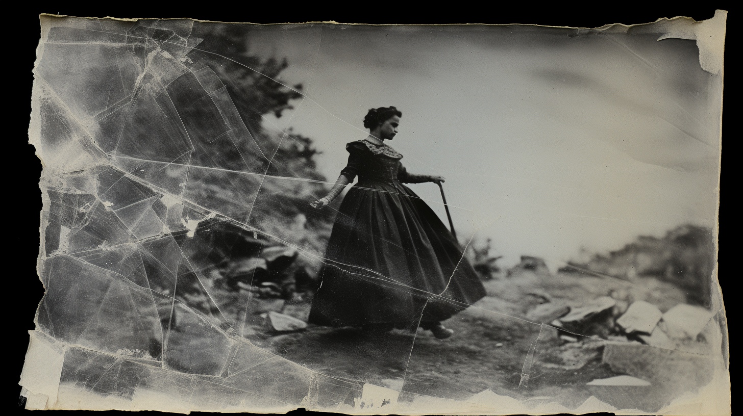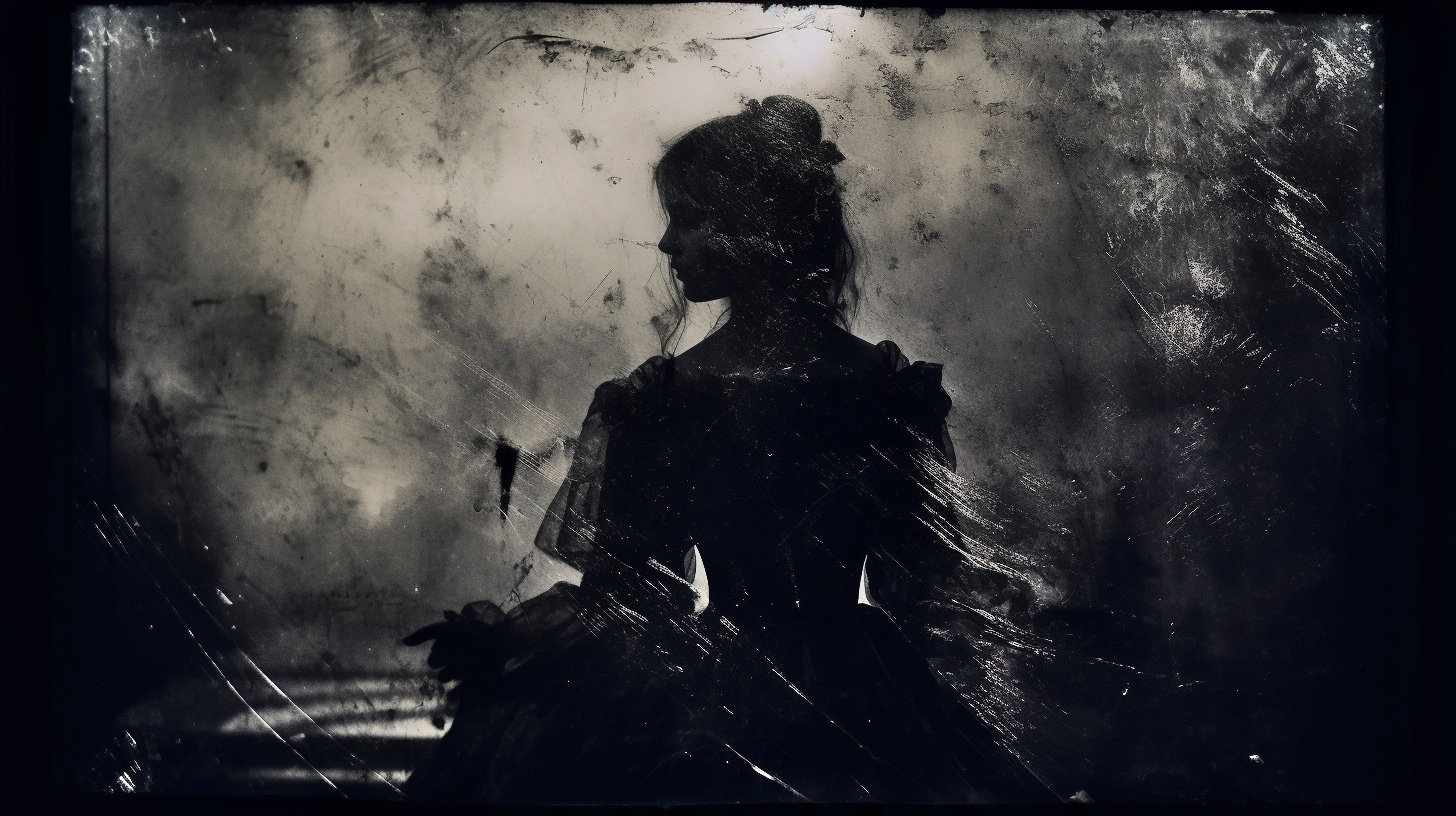 /imagine a black and white photograph on old plate glass, in the style of negative image, late 19th century, old albums, dark colors, rough-edged 2d animation, –ar 16:9
