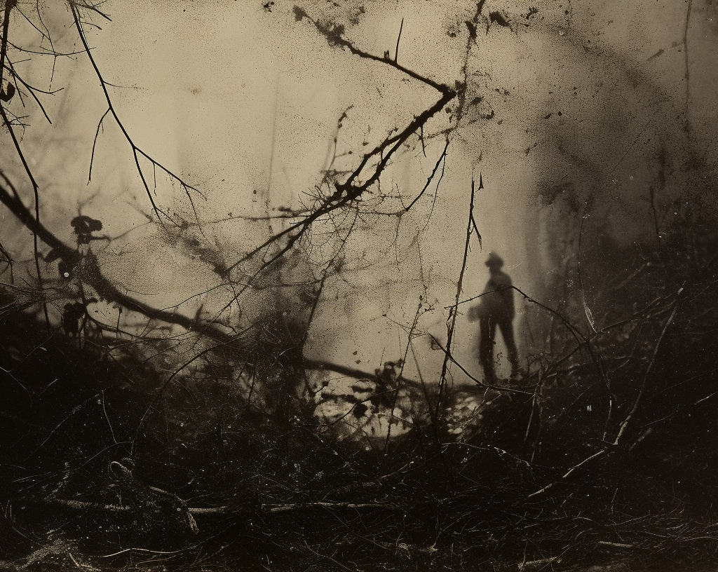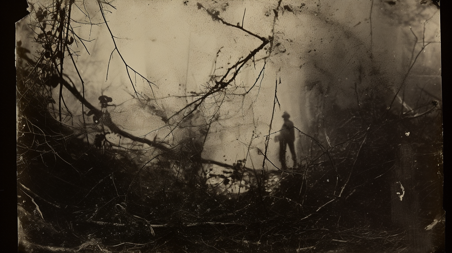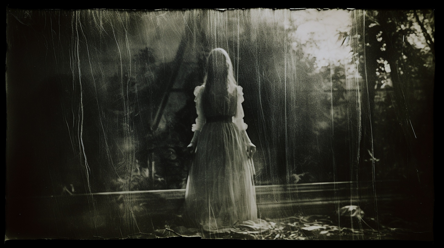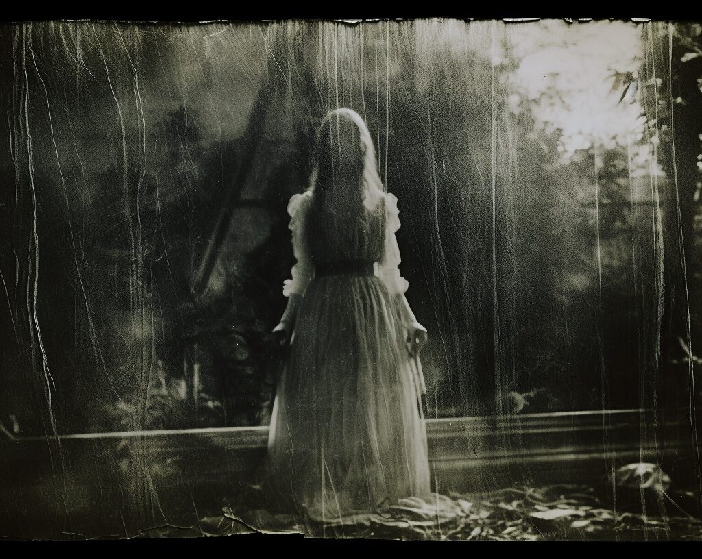 /imagine a black and white photograph on old plate glass, in the style of negative image, late 19th century, old albums, dark colors, rough-edged 2d animation, –ar 16:9